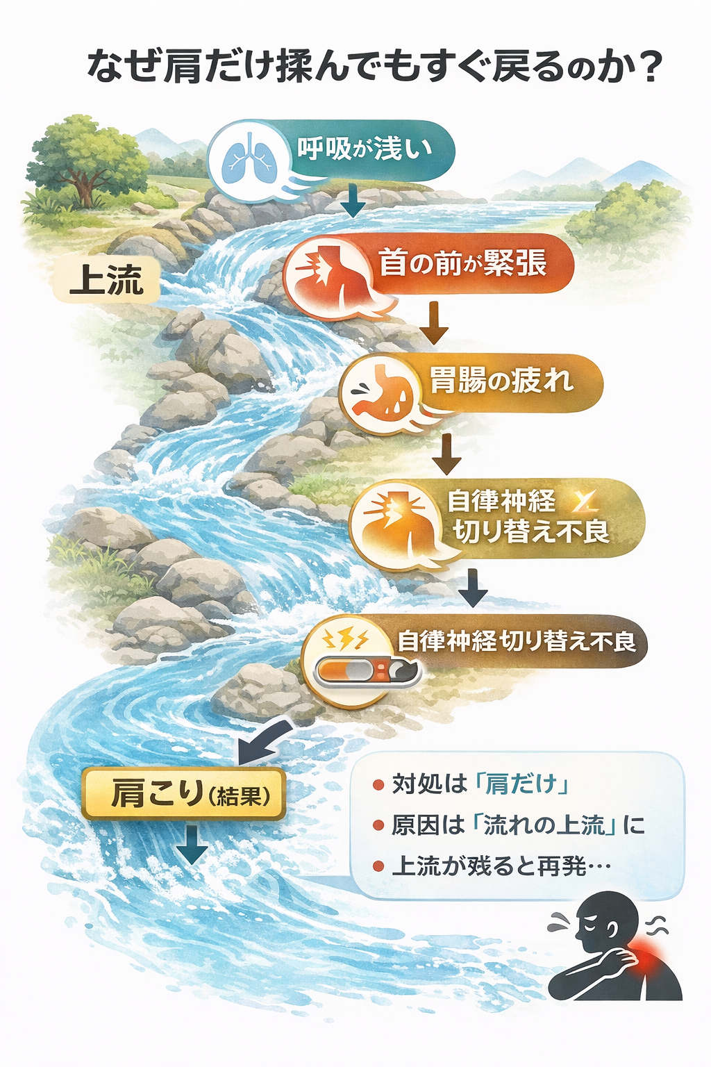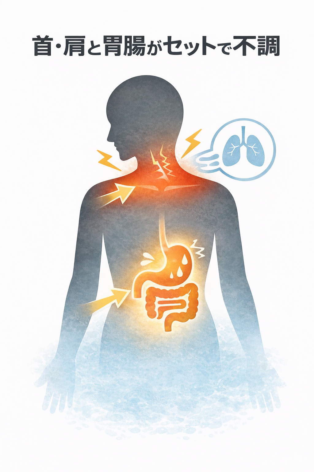 これが起きると、肩や首だけでなく、胃腸にも影響が出やすくなります。