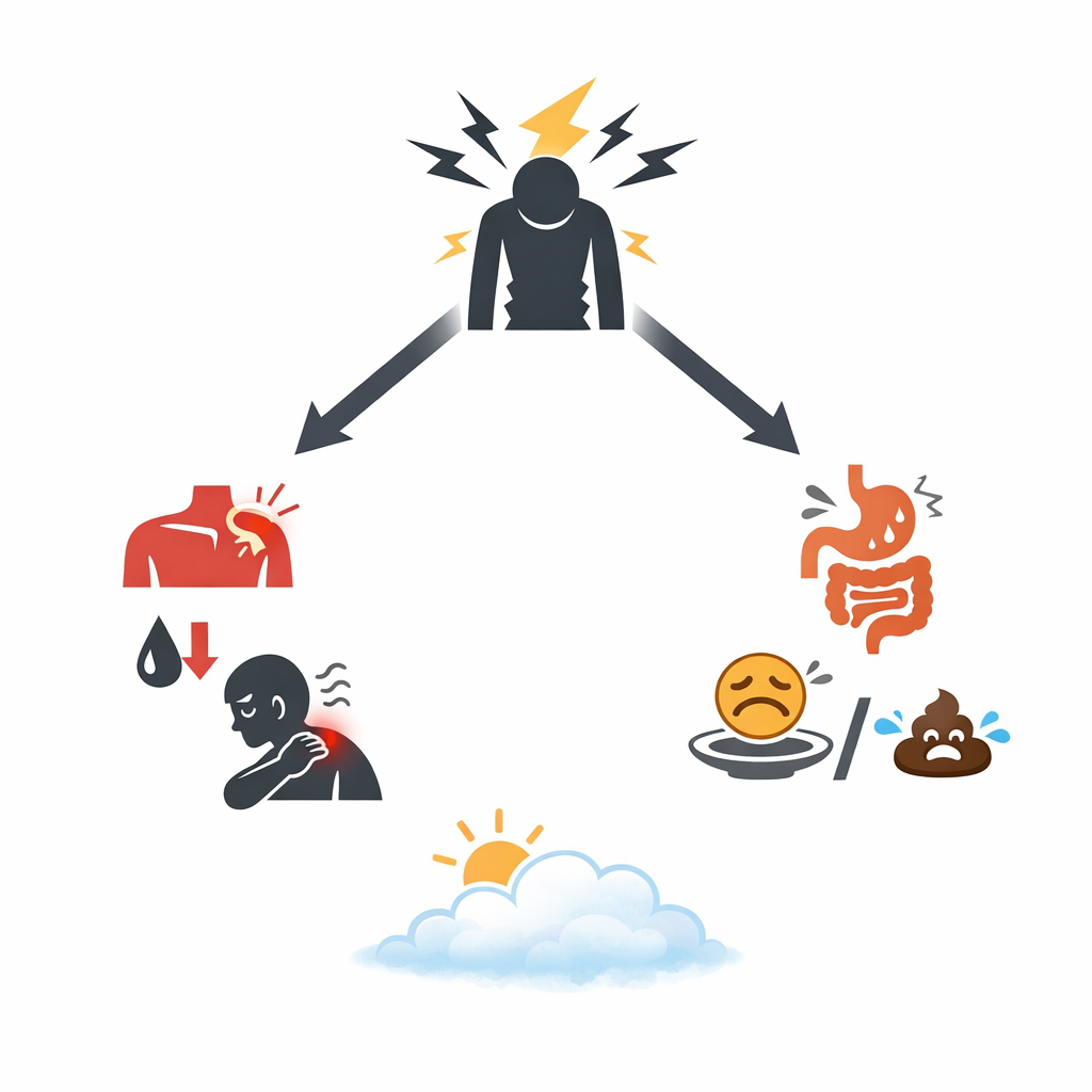 つまり「肩こり」と「胃腸の不調」は、別々のトラブルに見えて、同じスイッチの問題として並んでいることが多いんです。