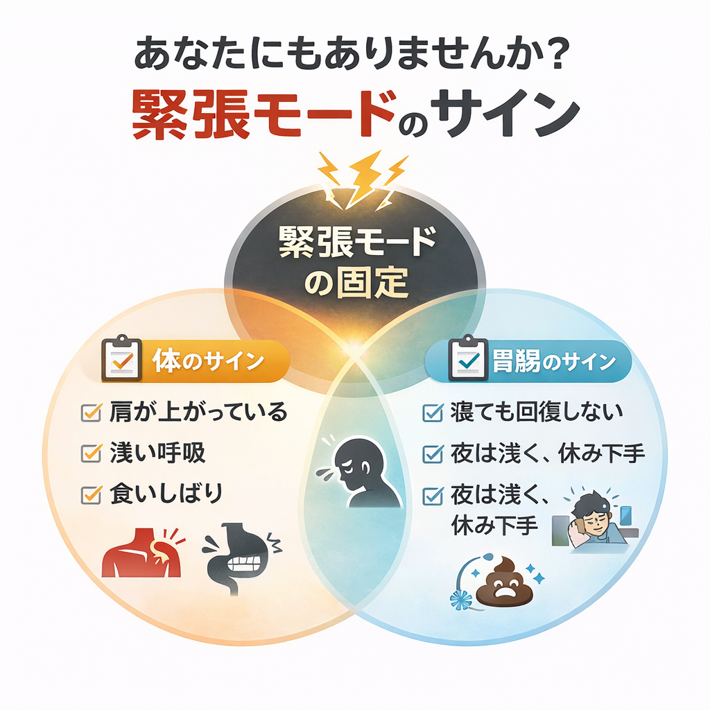 緊張モードが続くと、消化・吸収・排泄のリズムが乱れやすい。