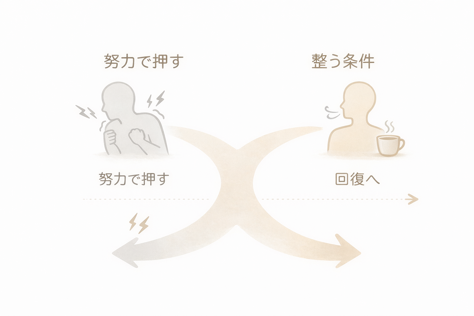 A. 弱いわけではありません。体が緊張モードのままだと、脳も「危険かもしれない」と感じやすくなり、不安や動悸として出ることがあります。回復が進むと、不安がゼロになるというより、不安に飲まれにくい/切り替えが早い方向へ変化するケースがよくあります。