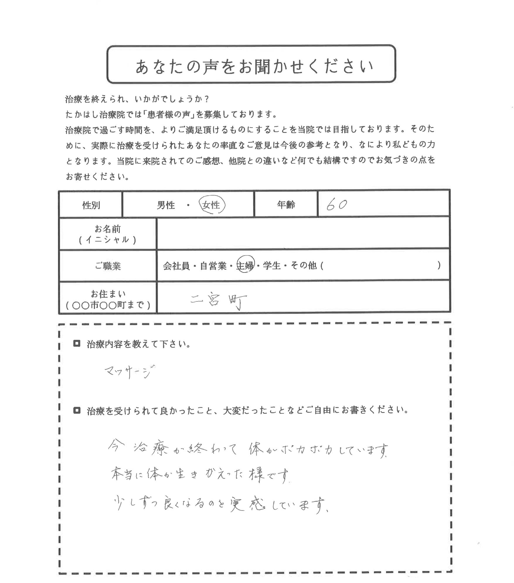 お客様の声 ホーム > お客様の声 > K.O様 女性 60歳(二宮町) K.O様 女性 60歳(二宮町) ご職業 主婦 お住まい 二宮町 治療内容を教えて下さい。 マッサージ 治療を受けられて良かったこと、大変だったことなどご自由にお書きください。 今治療が終わって、体がポカポカしています。 本当に体が行きかえった様です。 少しずつ良くなるのを実感しています。 « Previous 一覧へ Next »