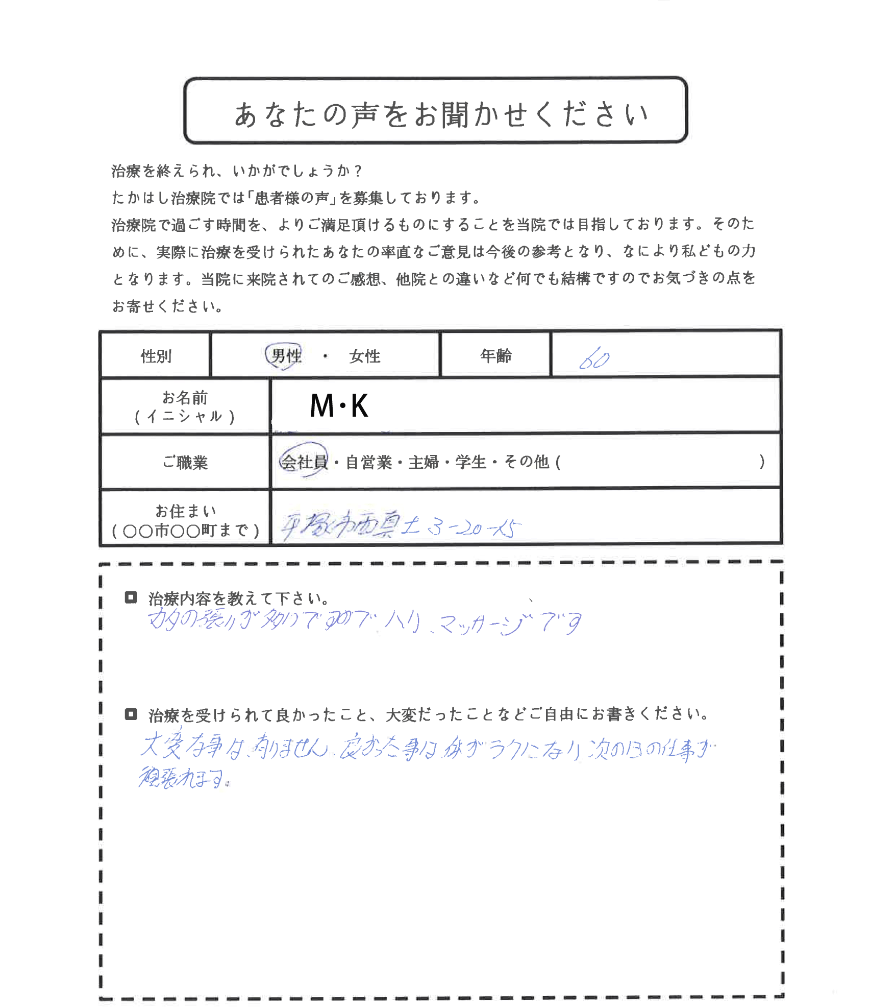 左肩を上げる事も辛かったが、治療後楽になった。 初めて頭に鍼を打ちましたが、ほとんど痛みも無かったです。 首から肩、背中、腰と痛みが広い範囲でしたが、マッサージや治療を受け少しずつ楽になっていく実感があります。 これからも治療を続けていきたいと思っています。